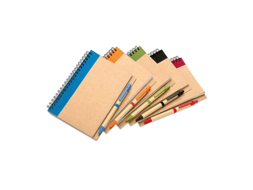 Recyklovaný poznámkový blok s perem.70 linkovaných listů ze 100% recyklovaného papíru. Pro spisovatele, básníky, školáky, úředníky i freelancery. Neexistuje profese, které by se nehodil praktický zápisník. Přispějte k čistšímu světu a používejte raději recyklovaný papírový poznámkový blok. Objednejte si designově vyladěný notes v kroužkové vazbě a s kuličkovým perem (také z recyklátu). Notes je efektivní doplněk do každé kabelky a batohu. Vyzkoušejte personifikovaný potisk a darujte blok jako dárek vašim blízkým. K dostání v několika barevných variantách.